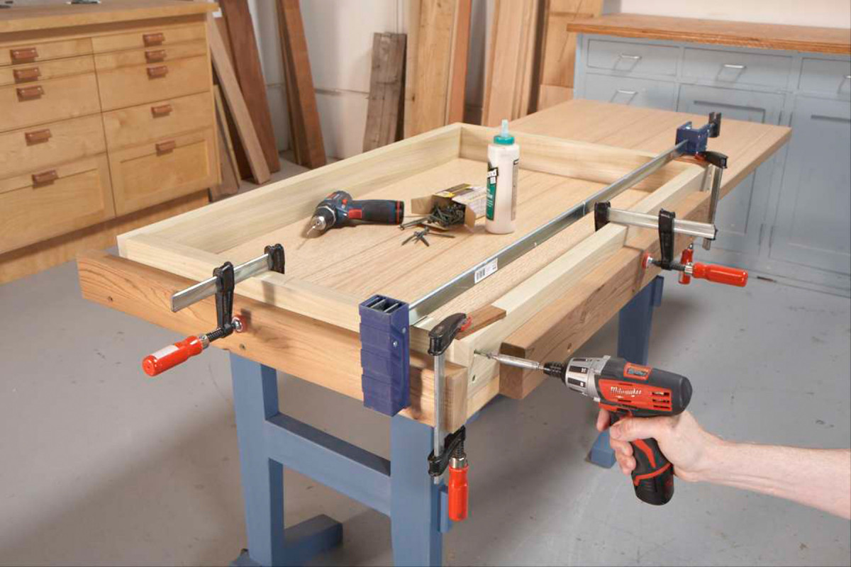 2. Build a pair of frames on the assembly table. Clamp their sides to the corner pieces to make sure each frame is square.