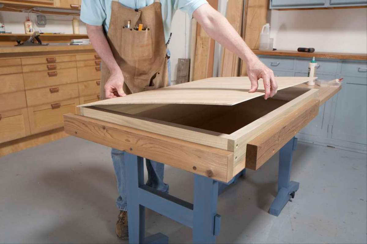 The key to successfully building this bench is to work on a large surface that is truly flat. I recommend using a 30″ hollow-core door (Photo 1). It’s inexpensive, easy to move and store, and will come in handy for building many other projects. Fasten two boards to the sides of the door to form a square corner.