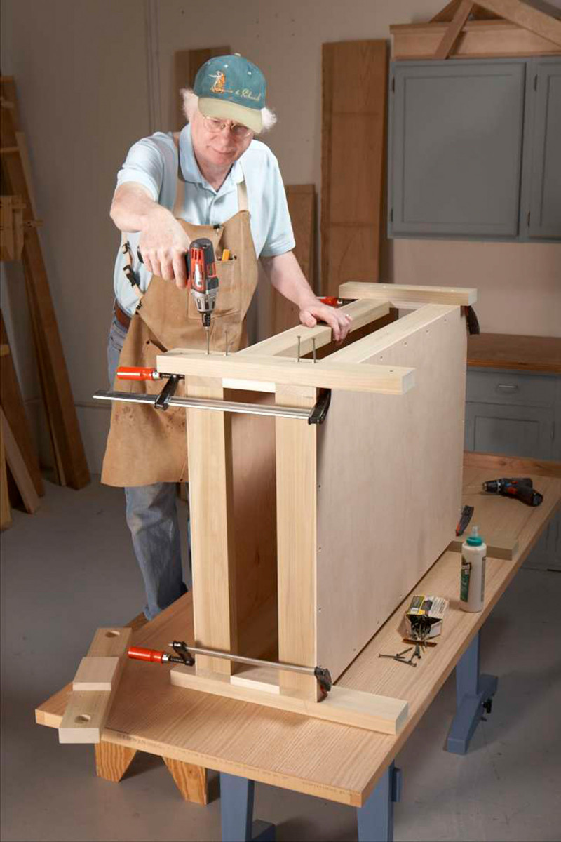 Cut the plywood panels (A9) for the frames (Photo 3, Fig. D). Note that they’re slightly oversize. Place the panels on the frames and drill pilot holes for the screws, spacing them about 5″ to 6″ apart. Glue and screw the panels to the frames. After the glue dries, use a router and a flush-trim bit to make the panels even with the frames.