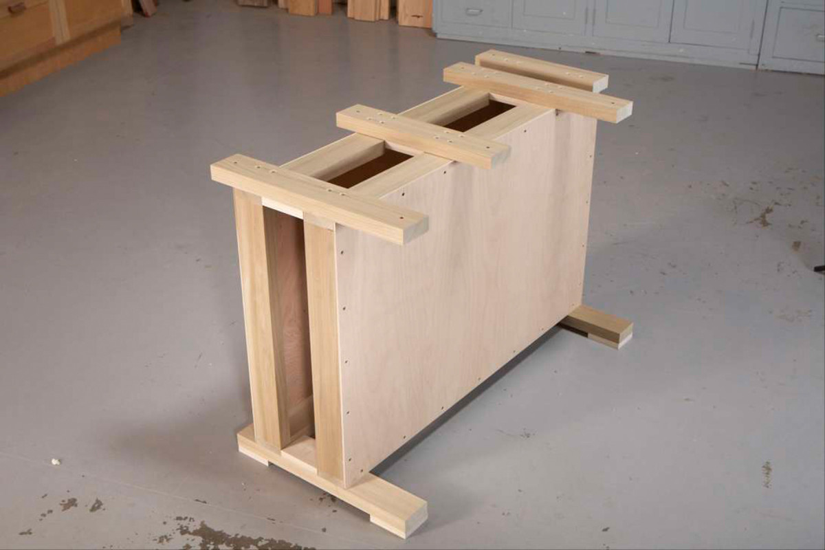 Rigid construction The base is a box that’s skinned with plywood. (The ends and top are removed here). It won’t rack, bend or twist.