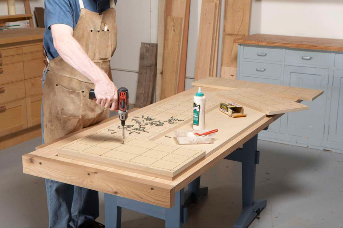 1. Make a flat assembly table—it’s essential for building this bench. A hollow-core door placed on a pair of sawhorses works well. Screw some boards to one corner to help keep your work square.