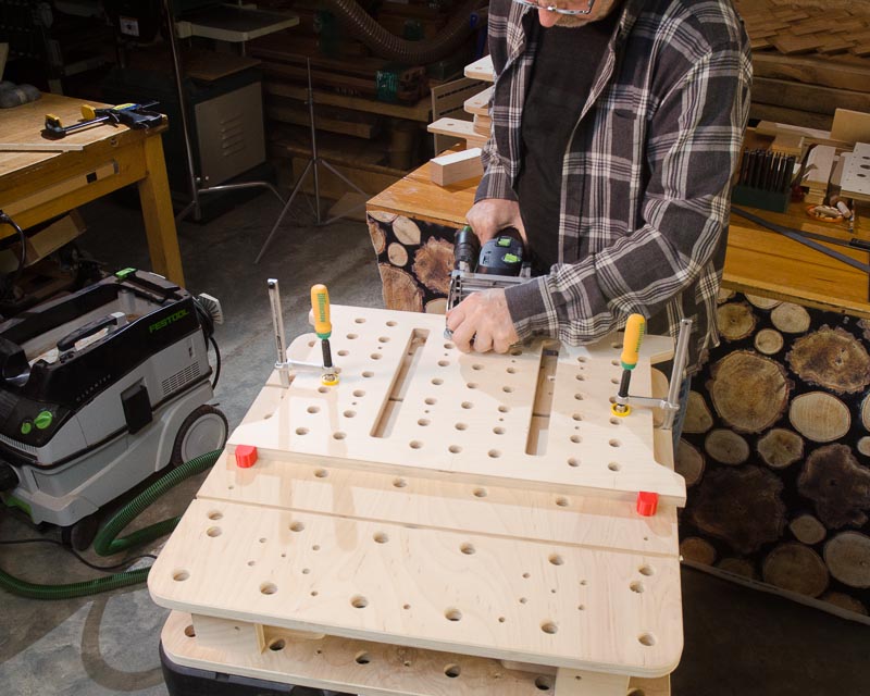 The dedicated workstation base is modern, made out of plywood, and is grid and system compatible with the top. The base adds to the workstation’s functionality and capabilities. Top plates can also be mounted vertically to the base, flush to the workbench edge so you can hold and position boards and workpieces. You can even take on a whole project better done vertically using the same grid, hold-downs, and dog system as the top. Using a combination of 5-layer stack lamination, box, and I-beam construction and making use of the top unit as a structural component to contract twist, the workstation base is stiff, stable, and yet completely open in the middle. The open area leaves room for a desktop-class CNC on a cart, space for system tool storage stacks, workstation mag-carts, a top plate rack, flexible shelving, and whatever you need the space for. The open box-section laminated legs are strong and designed for convenient dog and dog tool storage, the stretcher “cheese plates” between the sides of the base are also home for you to store and arrange workstation furniture.