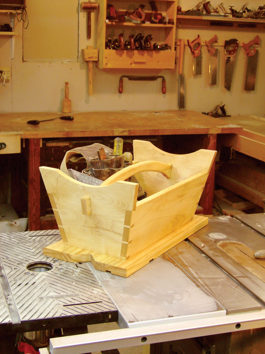 The StepBox has splayed sides for stability, ample room for my tools, and grooves and notches in the top for holding pieces of molding and drilling holes.