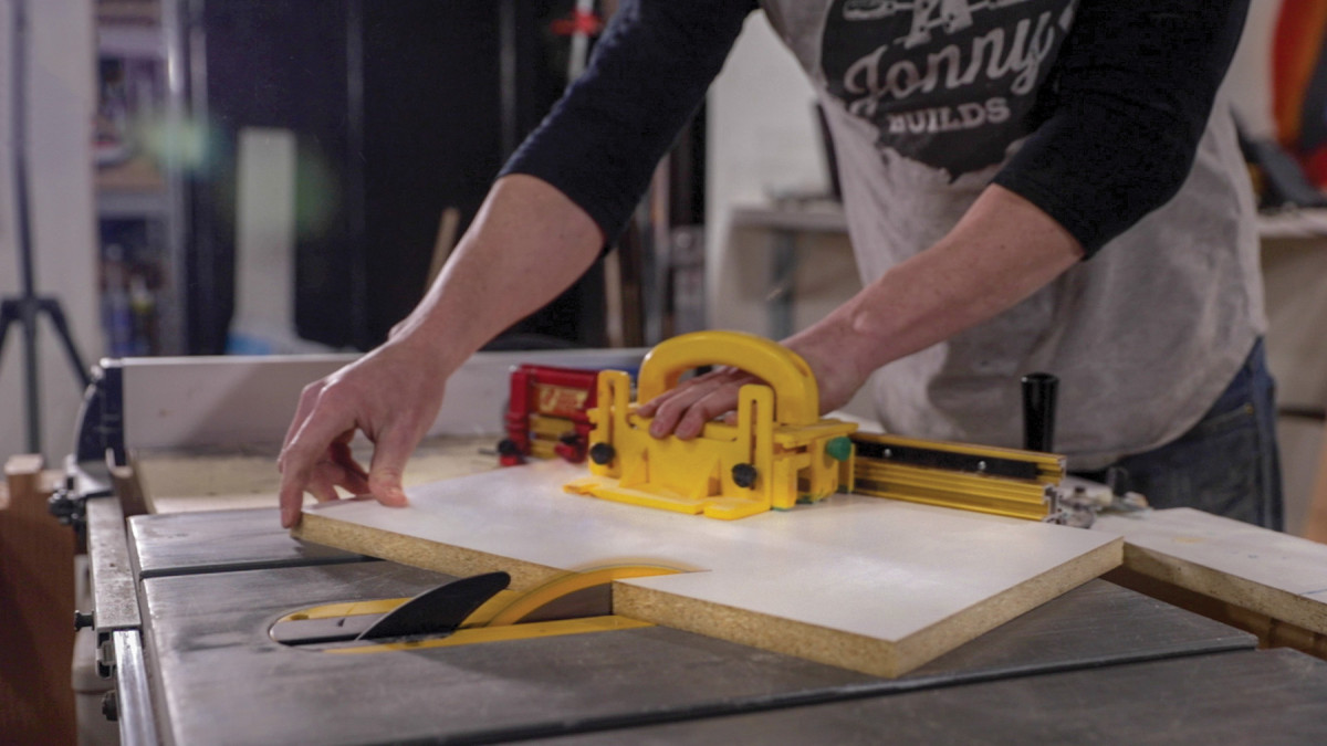 1. Cutting 30° support pieces for the waterfall base with a miter gauge on the table saw.