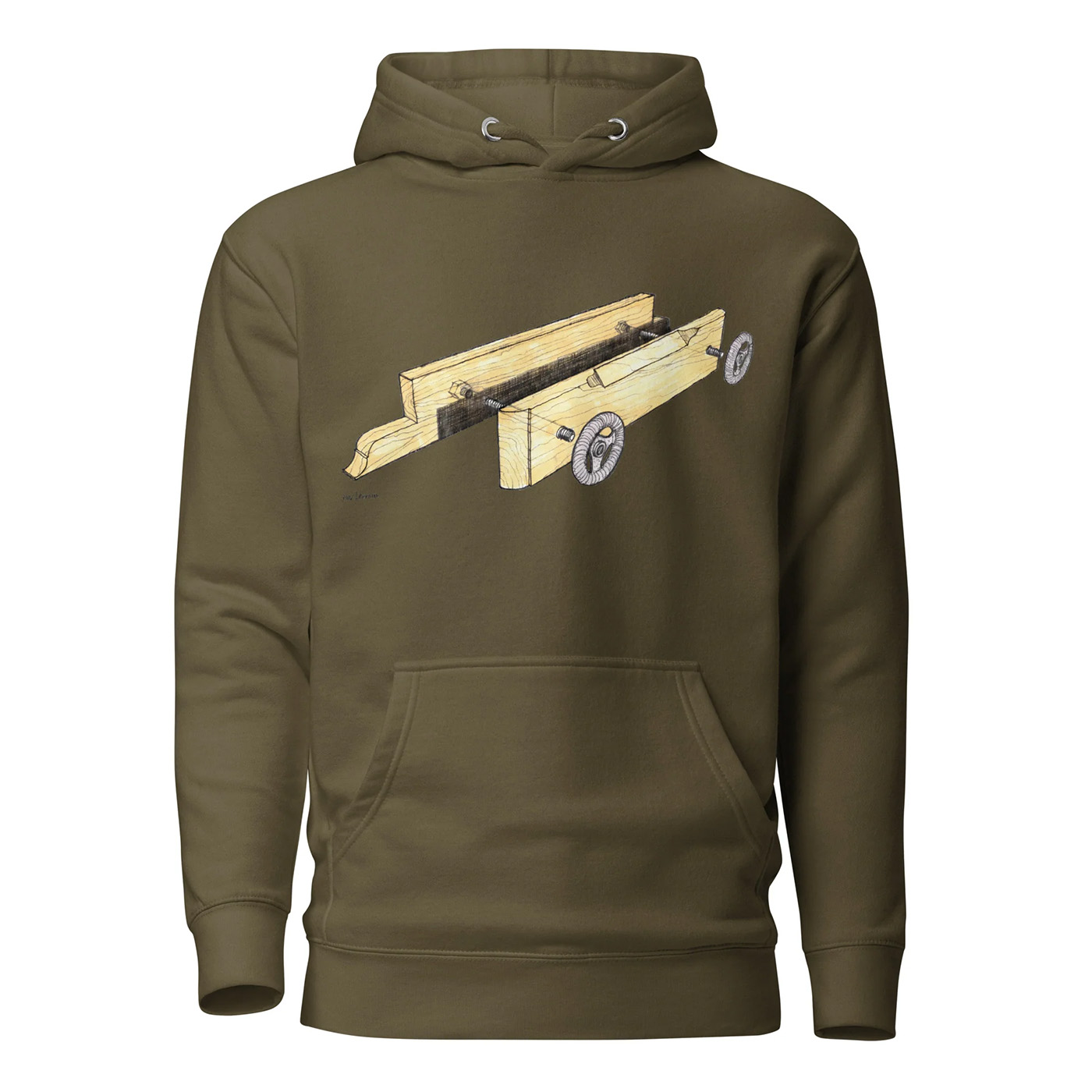 This super cozy hoodie features a drawing of a Moxon vise and is available in six different colors. It’s a sweatshirt that’s sure to draw compliments from other woodworkers. The design is also available on a t-shirt or coffee mug.