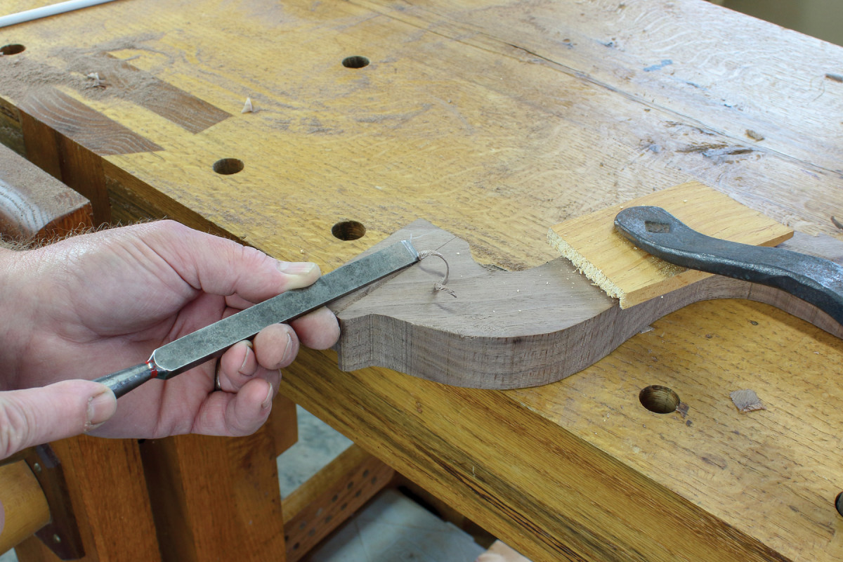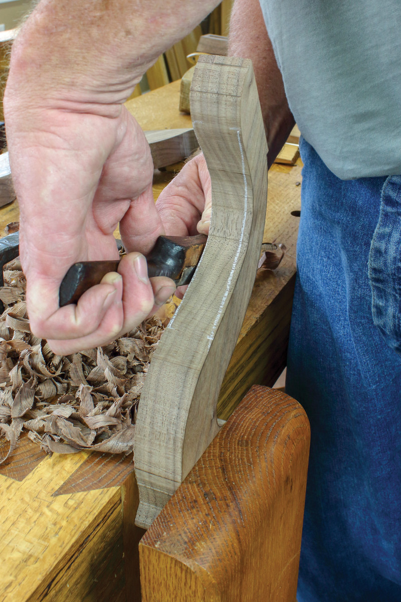 Use a chisel to round the areas above and below the cut. Here again, keep a close eye on the grain as you work to prevent chipping the foot or the pad. The bottom edge of the pad is rounded over as well.