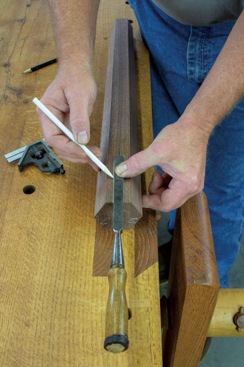 You can measure and find the center of the facet, mark 1/4” on either side of center and square off the bottom of the post to lay out the mortise sides. This gets a little trick, because there isn’t much area on the bottom of each facet to register the square. A small square is helpful. Take your time and double check your layout before you chop your mortises.
