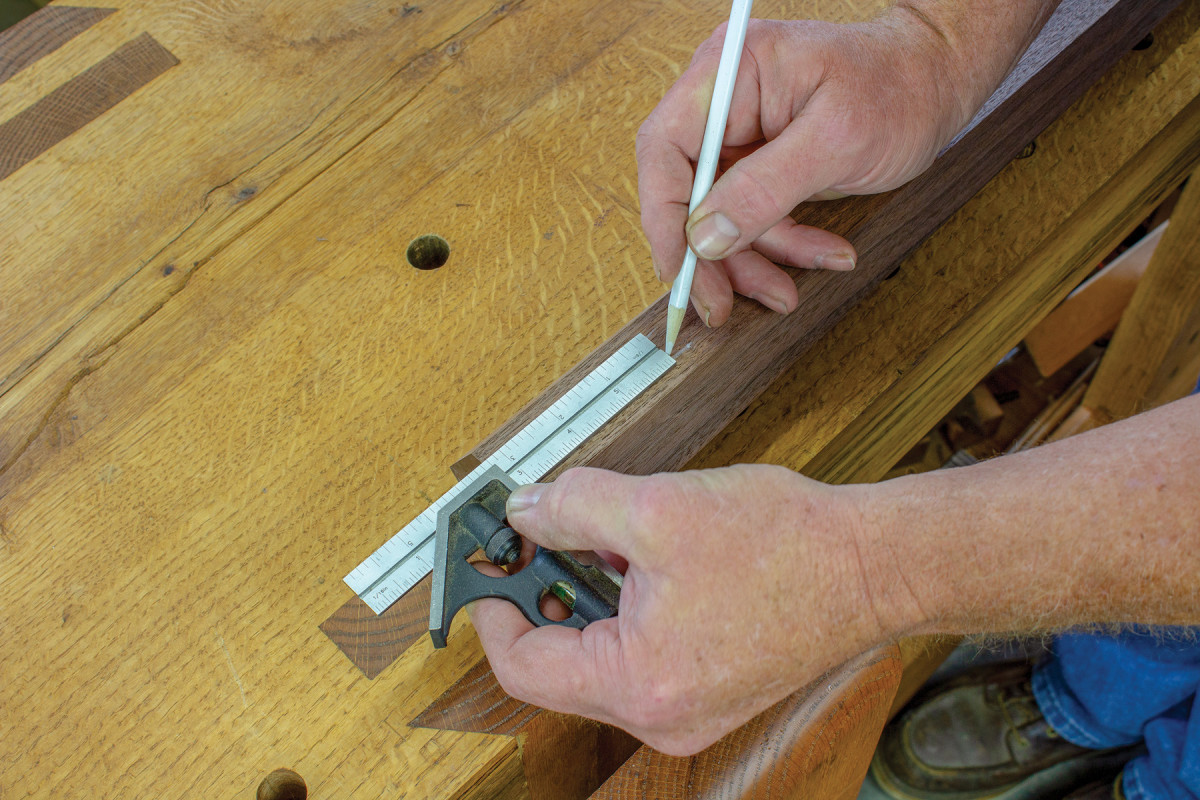 The battens have a taper on either end; these are quick to do and lighten the look of the parts a bit. It’s best to lay the battens out as a pair. First, find and mark the center, then measure either side of the center 23/4” and square the lines across. Next, measure or gauge from the top of the battens down 3/4” on either end. Use a jack plane to remove the majority of the waste and finish with the jointer.