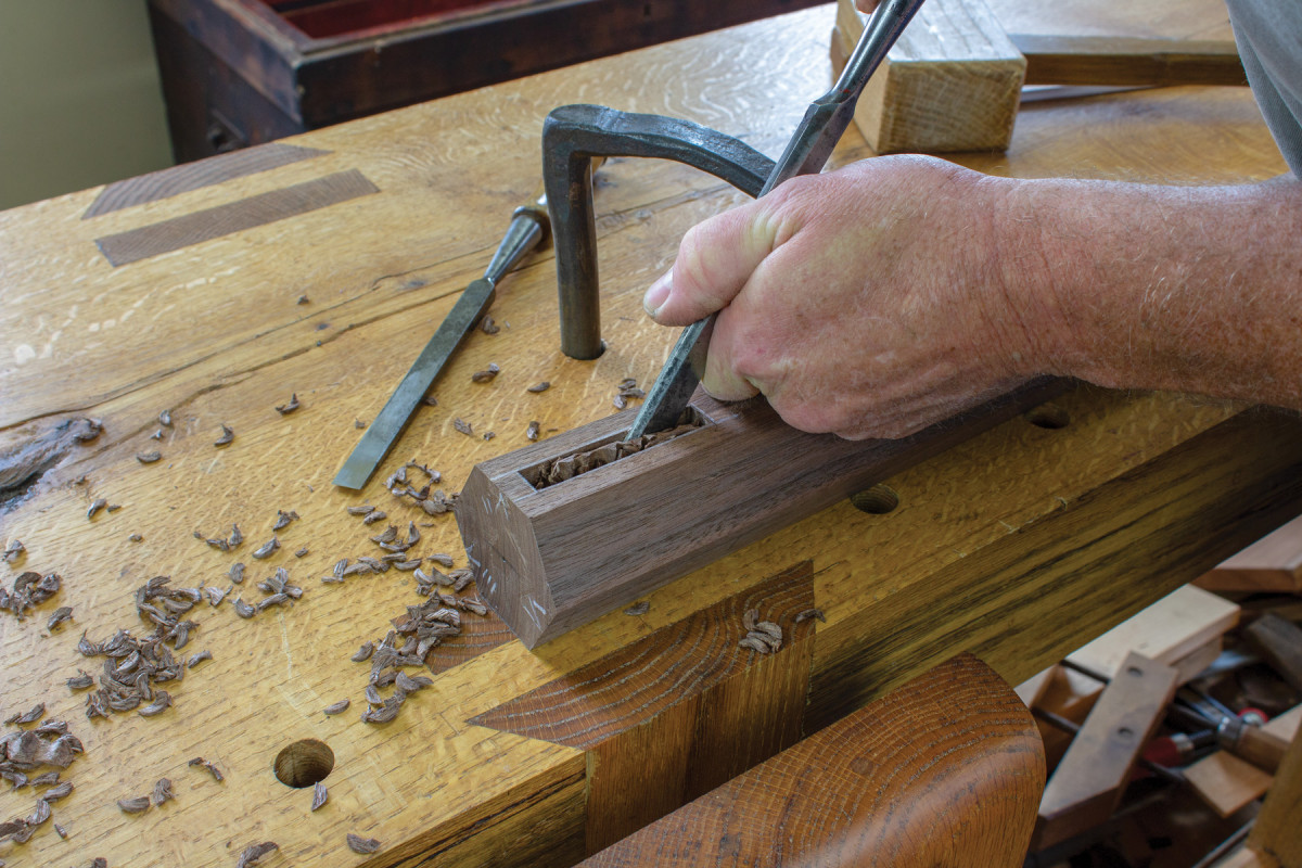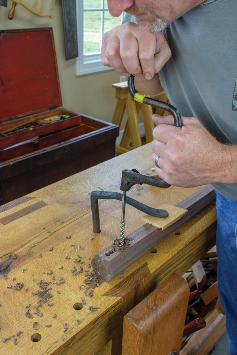 11. Most of the waste is bored out of the mortise with a 7/16″ auger.