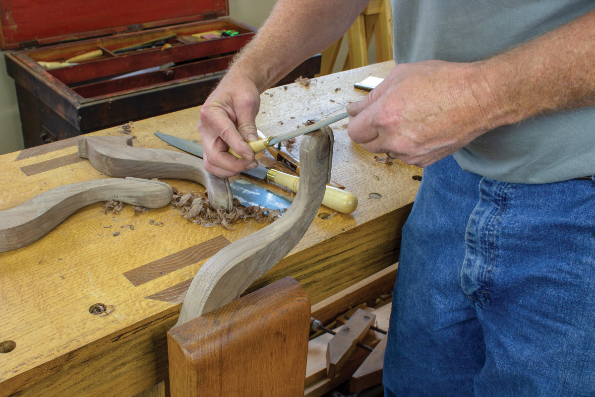 The undersides of the legs are flat so there’s not much to do here. Shave, scrape and rasp them smooth. Once all the shaping is complete, sand any areas that are still rough. It’s much easier to sand the legs now before they’re attached to the post.