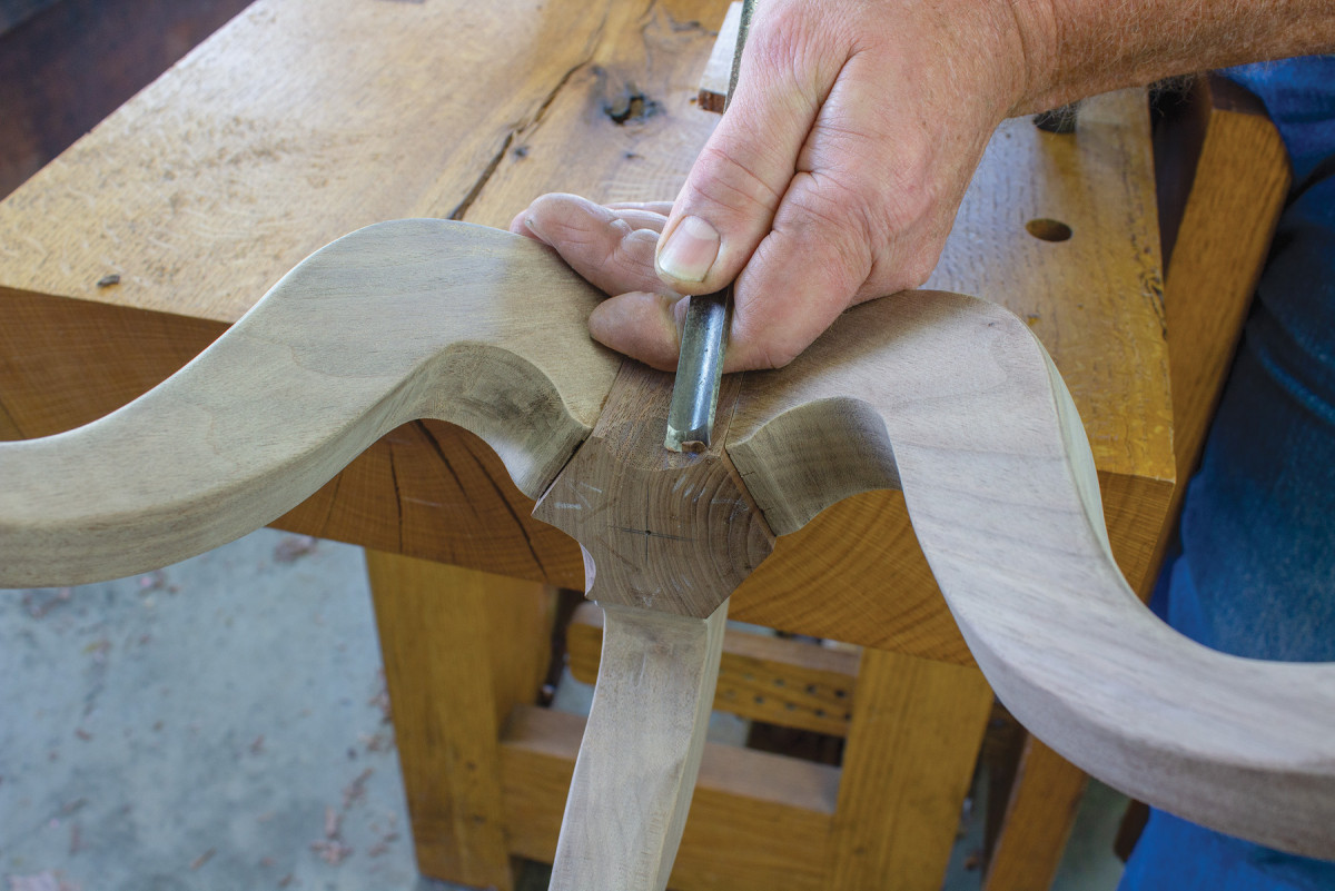 21. Pare the tenon down to a circle. Bore a 1/2″ auger hole in a scrap to test the tenon as you get close to size. Plane the top back corner of the mounting block to the radius of the tenons after the tenons are shaped.