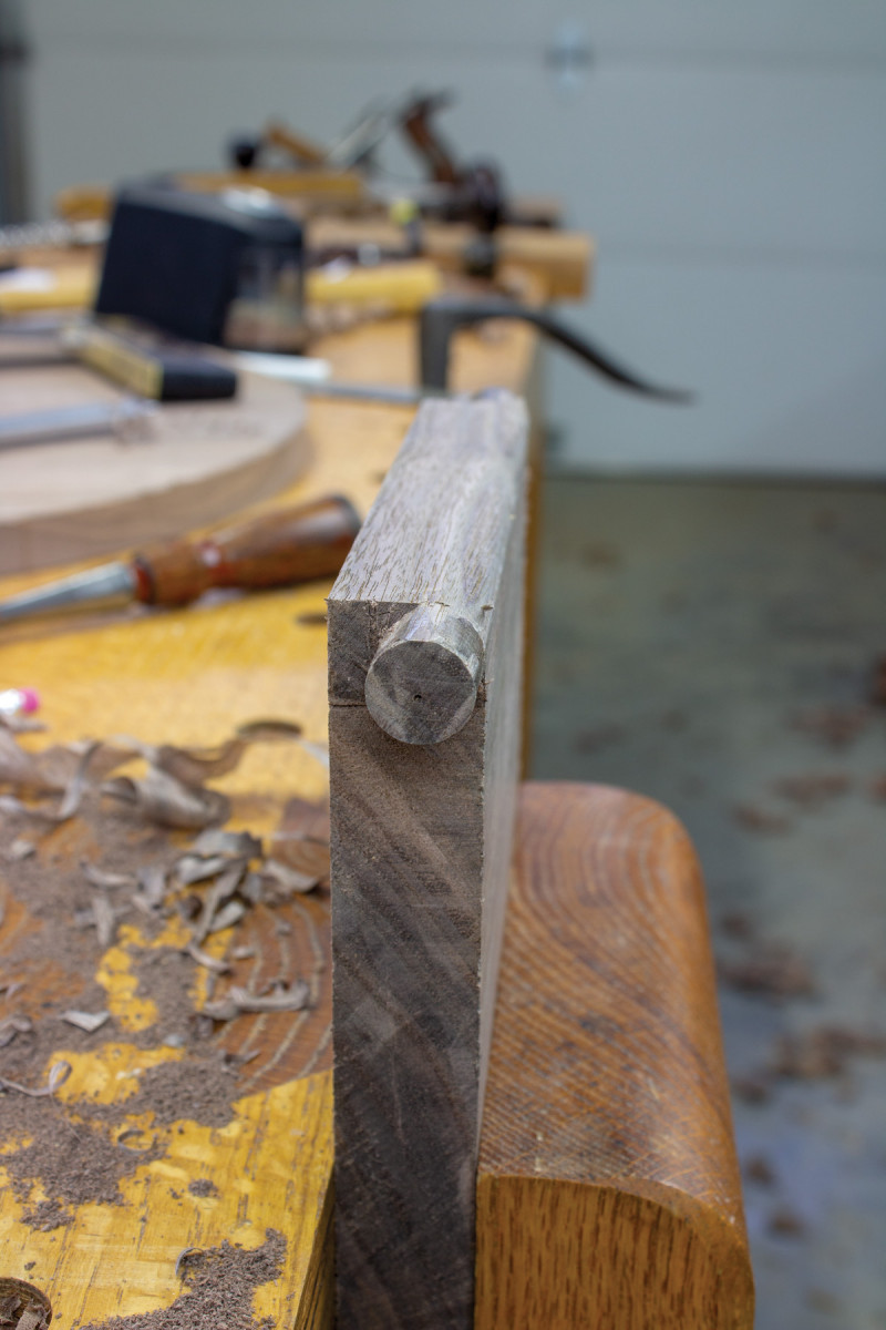 The top pivots on two 1/2” diameter round tenons that are shaped from the back edge of the top mounting block.