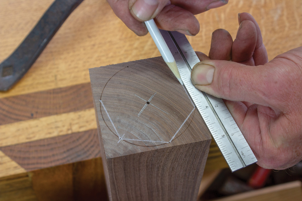 The large end of the post layout is identical but using a larger 23/4” circle. Be sure to use the same corner of the post blank to make the starter line on the lower end as you used on the top. This will assure the facets, or the two hexagons, are aligned between the two ends.