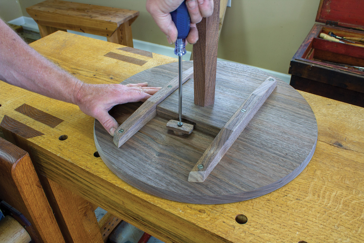 Next, on the underside of the top, use a straightedge aligned to the center mark on the underside of the top, and make a mark across the grain the width of the top. Make a parallel line 3″ on either side of the first line. Assemble the mounting block and battens, align the inside edges of the battens with the layout lines. Slide the assembly so the center mark of the top is in the center of the 1″ hole of the top-mounting block. With everything in place, mark the screw locations to the top and bore the pilot holes.