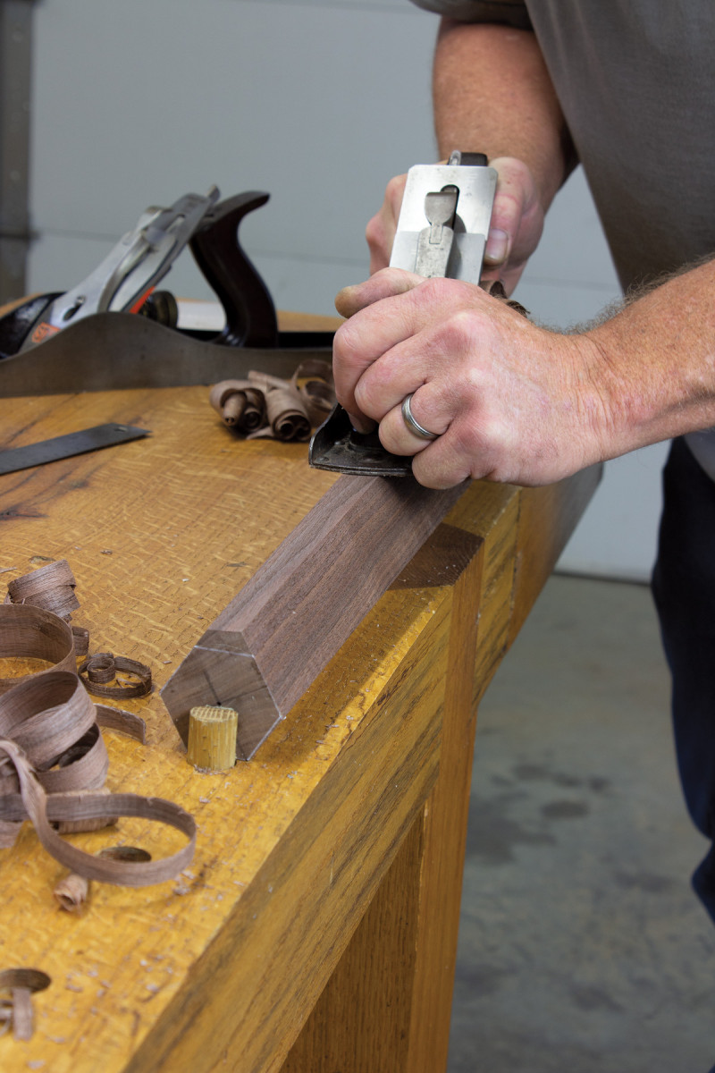 Clamp the blank to the bench and use a jack plane with a heavily cambered iron to hog off most of the waste on one facet of the post. Once you’re close to the layout lines, finish with a jointer plane. A long straightedge is handy to make sure the facet is straight over the length of the blank. With the first facet complete, flip the blank over and do the facet opposite the one you just completed. Continue on around the post in this manor until all six are finished.