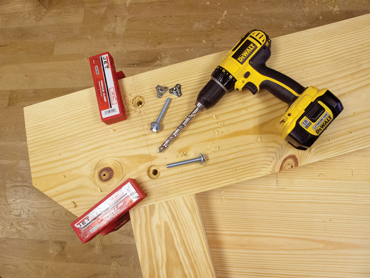 Clamp a leg to one of the aprons, making sure the leg is snug against the notch created by the apron’s 1 x10. Now lay out and drill the counterbore for the washer and the clearance hole for the bolt’s shaft. The clearance hole should go all the way through the apron and leg. The counterbore should be deep enough to hold the head of the bolt, the washer and the lock washer.