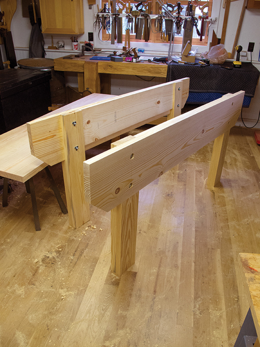 Legs & aprons. With the legs and aprons bolted together, you can glue up the parts for the benchtop.