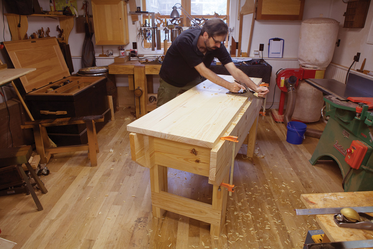 The top surface of the benchtop is made from 2x12s that have been edge-glued to create a flat panel. This benchtop is 22-1⁄2” wide because it is made from two 2x12s. You can make it narrower if you like – an 18″- to 20″-wide bench is stable enough for handwork.