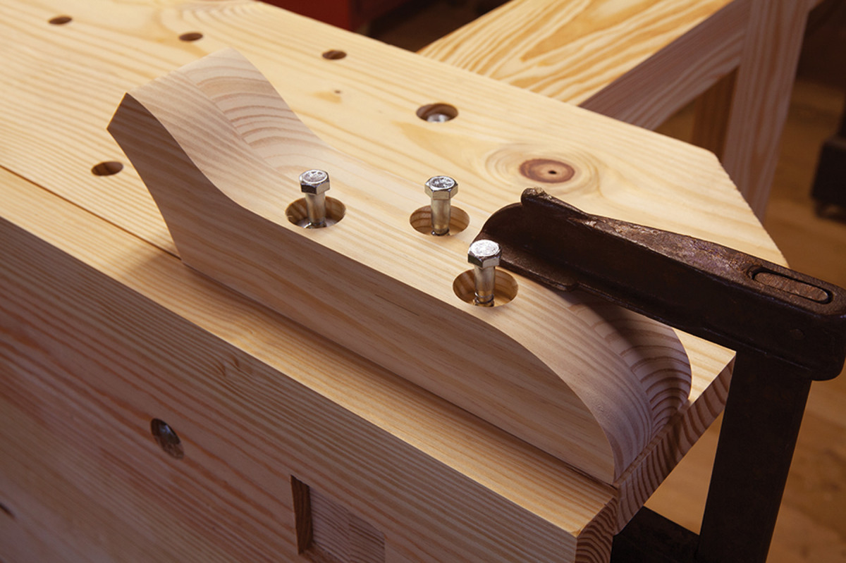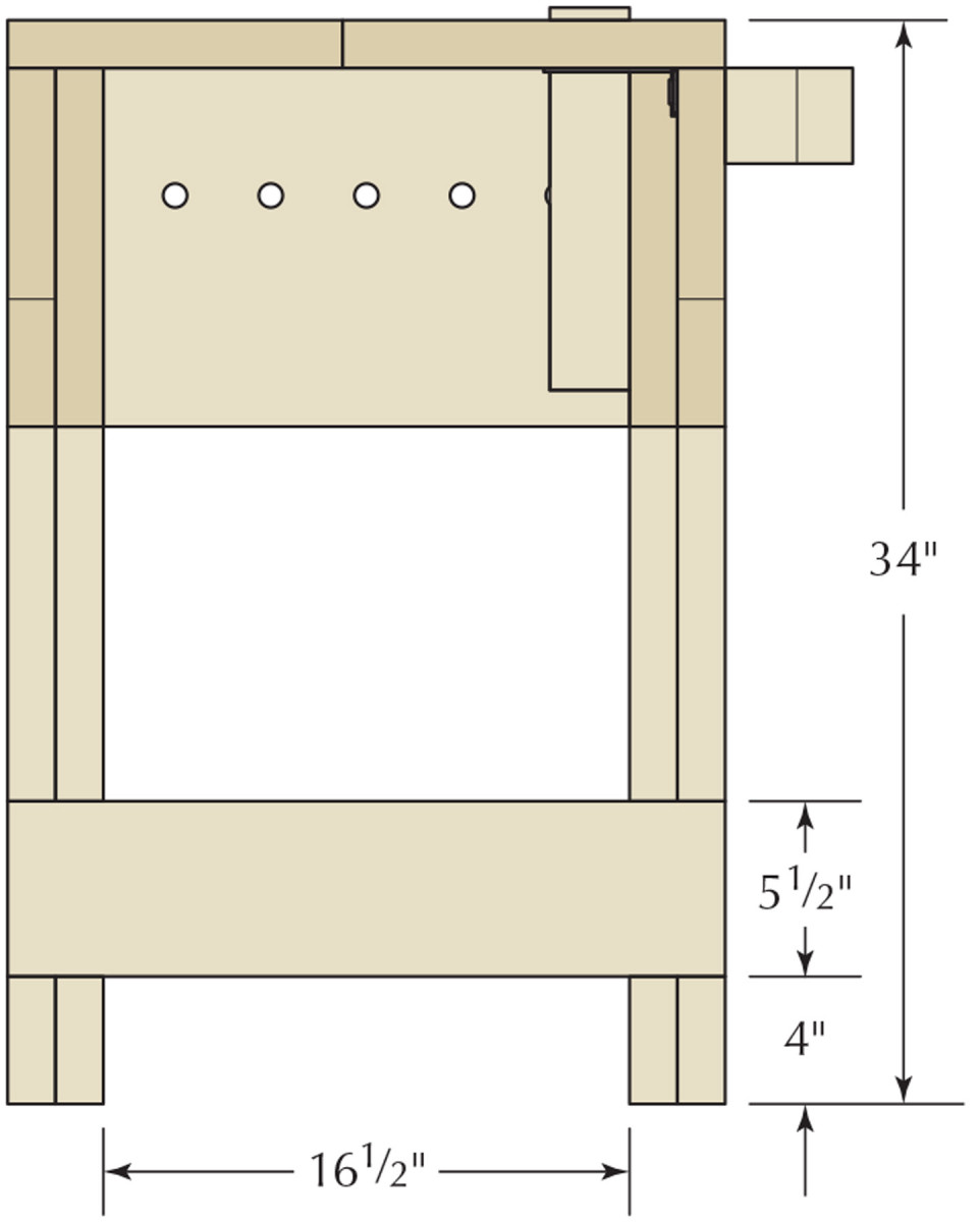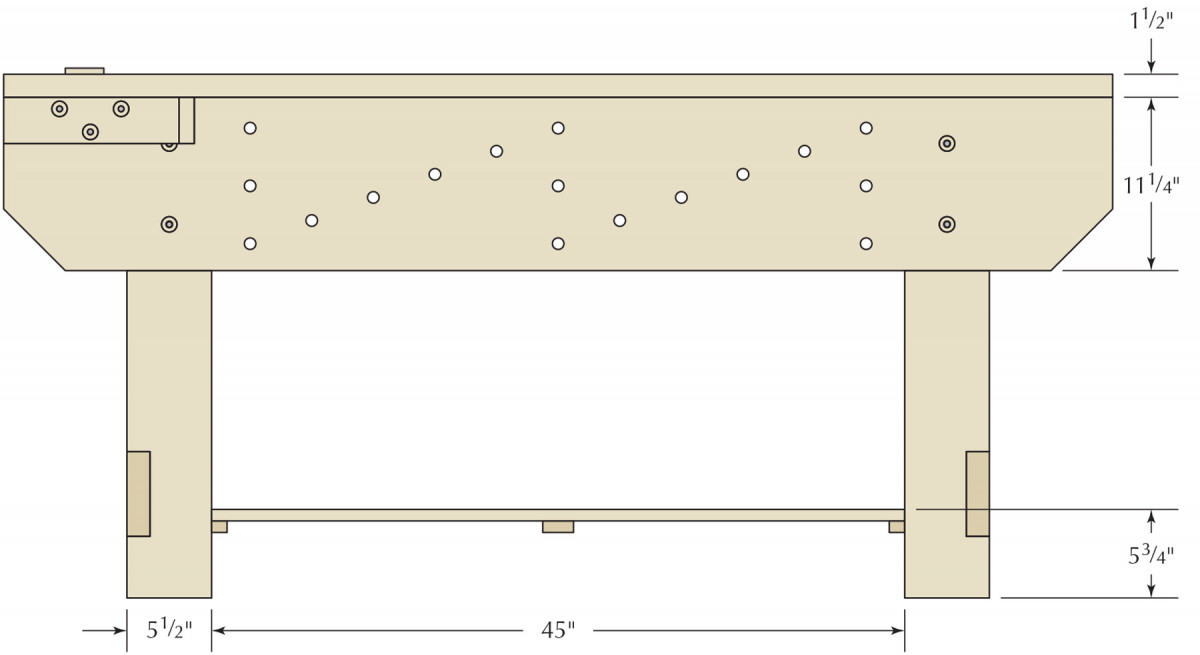Drill 3⁄4“-diameter through-holes at each of these locations. These holes in the aprons are great for supporting work from below, especially when edge-planing or dovetailing.