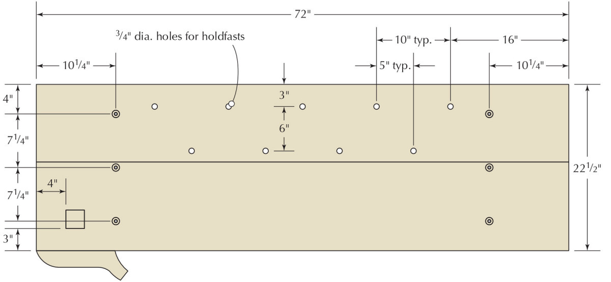 Now lay out the holdfast holes on the benchtop. My preference is to have two rows of holdfast holes on the benchtop (you can always add more later). One row is about 3″ from the back edge of the benchtop. These should be spaced every 10″ to 16″ depending on the reach of your holdfast. Then make another row of holdfast holes about 6″ in front of your back row. These should be spaced similarly, but these holes should be offset from the first row, as shown in the drawings and photos.