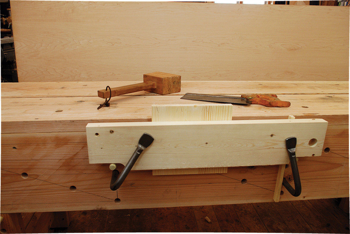 Dovetail saw cuts. Secure the workpiece against the apron with a thick batten held flush to the benchtop with two holdfasts, and supported by two pegs in the apron’s holdfast holes. I like to take a scrap of stock the same thickness as the material being dovetailed and put it to one edge of the chop. I place my holdfast just to the inside of the scrap and give it a good whack. This will keep that end of the chop fixed so that I need only to loosen the other holdfast when changing out parts to be worked.