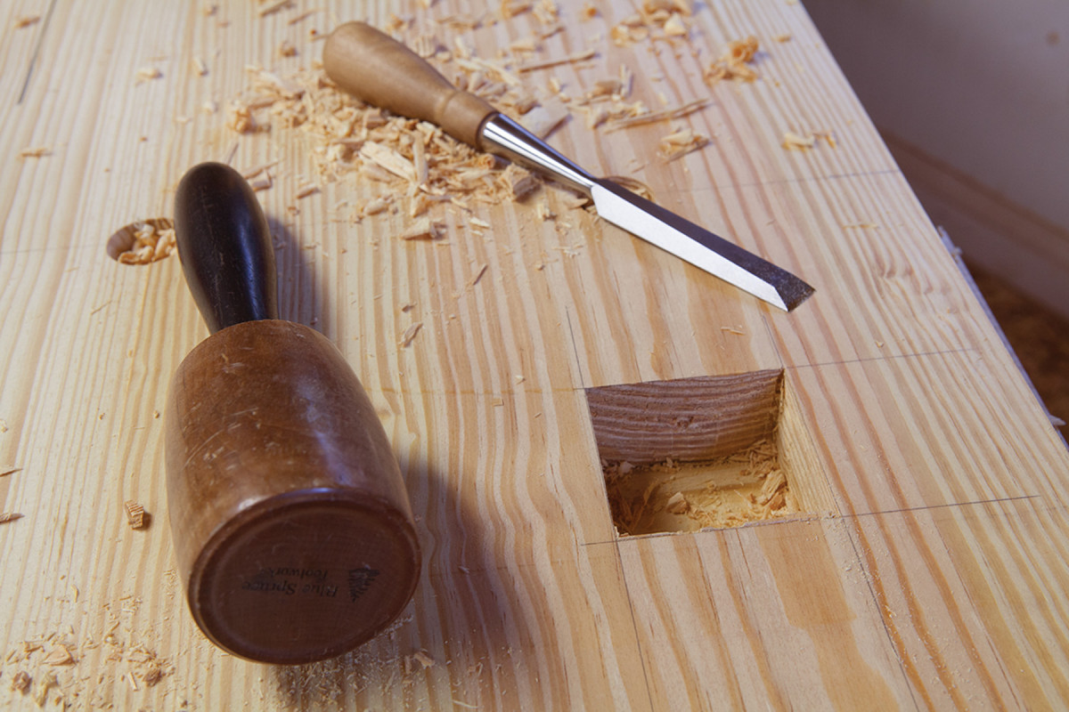 Lay out the mortise on both faces of the benchtop. Then bore out most of the waste with a large-diameter bit. Finish the walls with a chisel. It pays to check the walls so they are perfectly square to the benchtop.