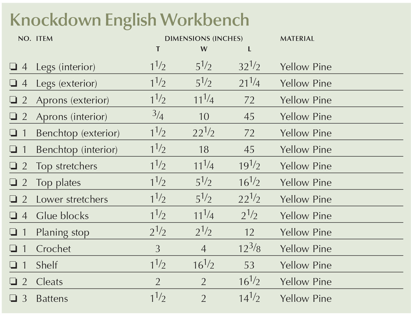 Knockdown English Workbench Cut List and Diagrams