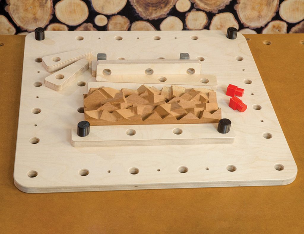 It’s not by accident that I chose the word “furniture” for this key workstation accessory. As woodworkers, we think of furniture as the practical things we create and use in our homes, but the term “furniture” is also used in another way in different world that also has a long history: letterpress printing. Letterpress furniture are the blocks of hardwood in specific widths, lengths, and thicknesses used to position lead type, cuts, and rules that make up a printed page. Once the type and elements are in position, the space around them is filled with letterpress furniture and locked up with letterpress Quoins, which are simple mechanical wedge mechanisms. Since letterpress furniture comes in sets of known sizes, a pressman can position the printed elements exactly where they want them to be on a page. I used the same concept, combined with the grid-based dog system to give woodworkers and makers the ability to position and securely hold workpieces. And, just like letterpress furniture, workstation furniture needs to be precise.