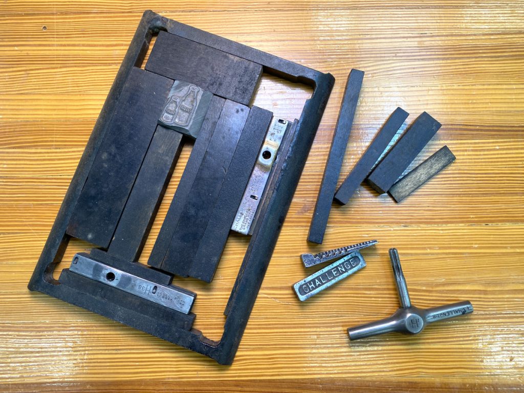 Look familiar? This a frame called a “chase” for a platten-style letterpress. Inside is a metal “cut” of a pair of milk bottles. It’s positioned and surrounded by letterpress “furniture” of various sizes and held in place with adjustable wedges called “quoins” that are set with a “key”.