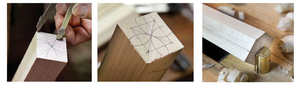 The legs are tapered octagons. They are 1-5⁄8″ square at the top and 1″ square at the foot. The top of the leg has an 1-3⁄8″-diameter x 1-1⁄2″-long round tenon. To make the legs, first mark the 1-5⁄8″ octagon on the top of the leg and the 1″ octagon at the foot. See “Octagons Made Easy” below.