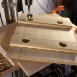 These stools have a handle in the middle that makes them easy to carry around. This handhold is 1″ x 3″ and runs parallel to the grain. Bore it out using a brace and bit or a drill press and finish the shape with rasps.