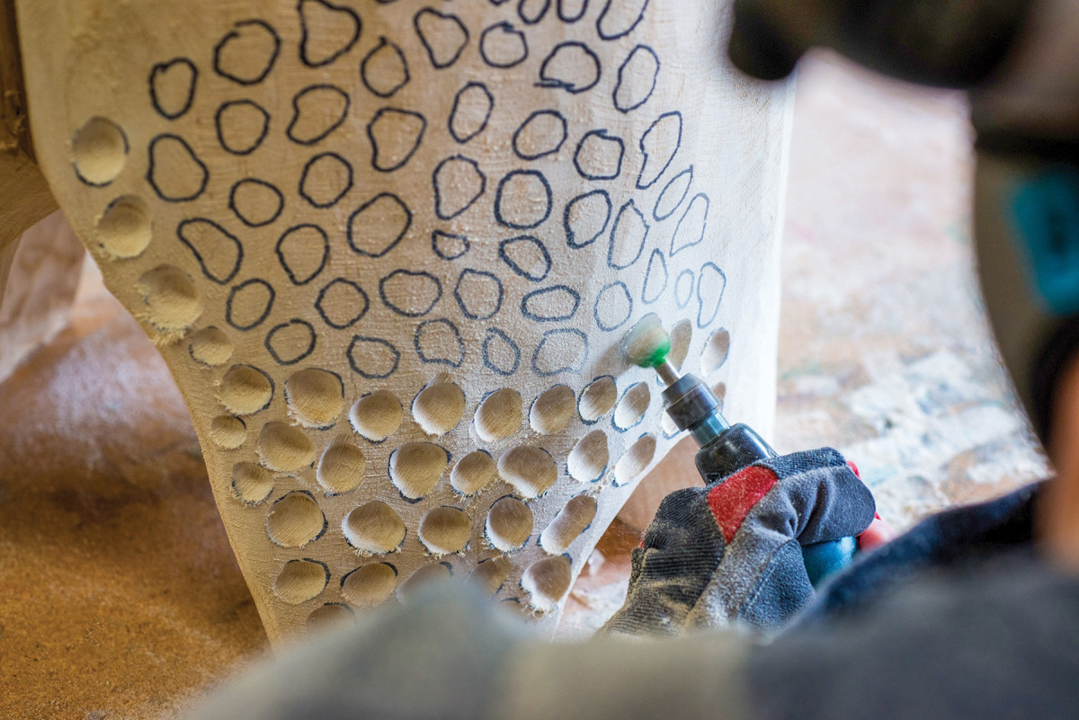 The tool to use to add the texture is dependent on the type or shape of texture you want to add. Carving the divots is a two-part process for me. The first part is to use a coarse grit ball carving burr with my die grinder, and I carve every divot to shape. The second part comes after I have sanded the whole table up to 180 grit. Then I take a fine grit ball carving burr with the die grinder and go back over every divot, really working to remove the tool marks from the coarse grit burr.