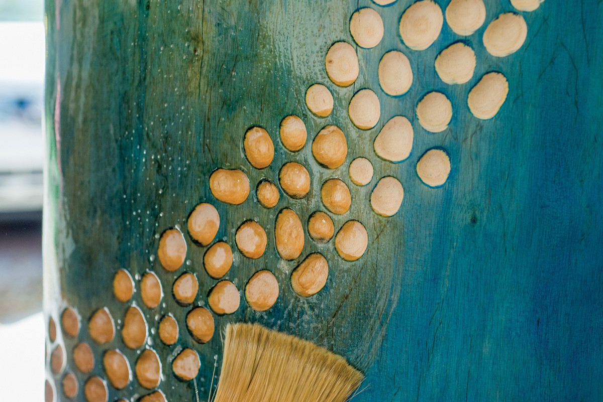 Though I was removing the material from the surface of the log, I was also creating a side surface. The side surface was a bit difficult to keep consistent with the multicutter and was very dependent on the size of the cutaway. After using the multicutter, I used the carving dish on the larger cutaways, and used a die grinder with a Kutzall rotary carving burr for the smaller cutaways. The carving dish and burr were used to reach the desired final design.