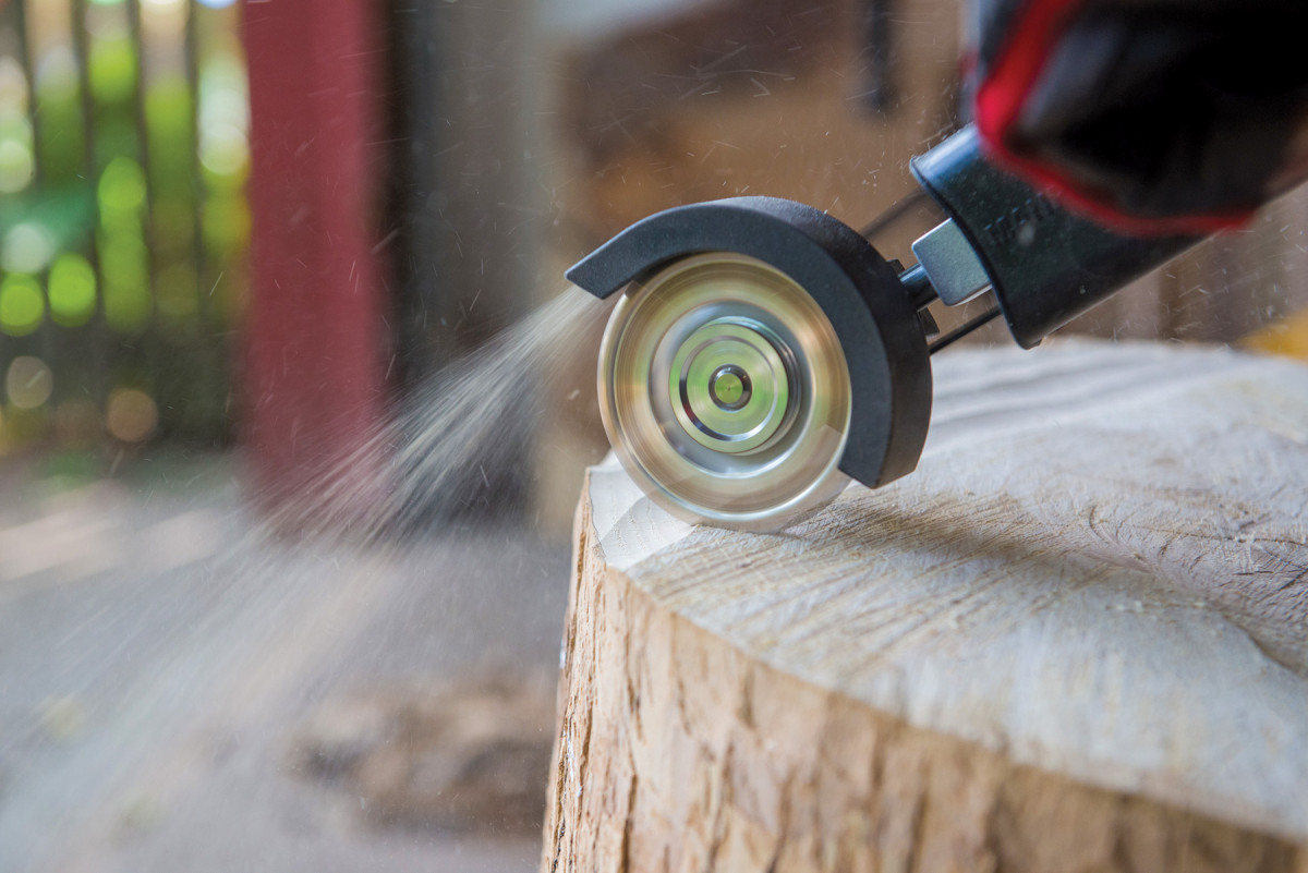 First, I use a Manpa multicutter with an angle grinder, to quickly remove material for log leveling.