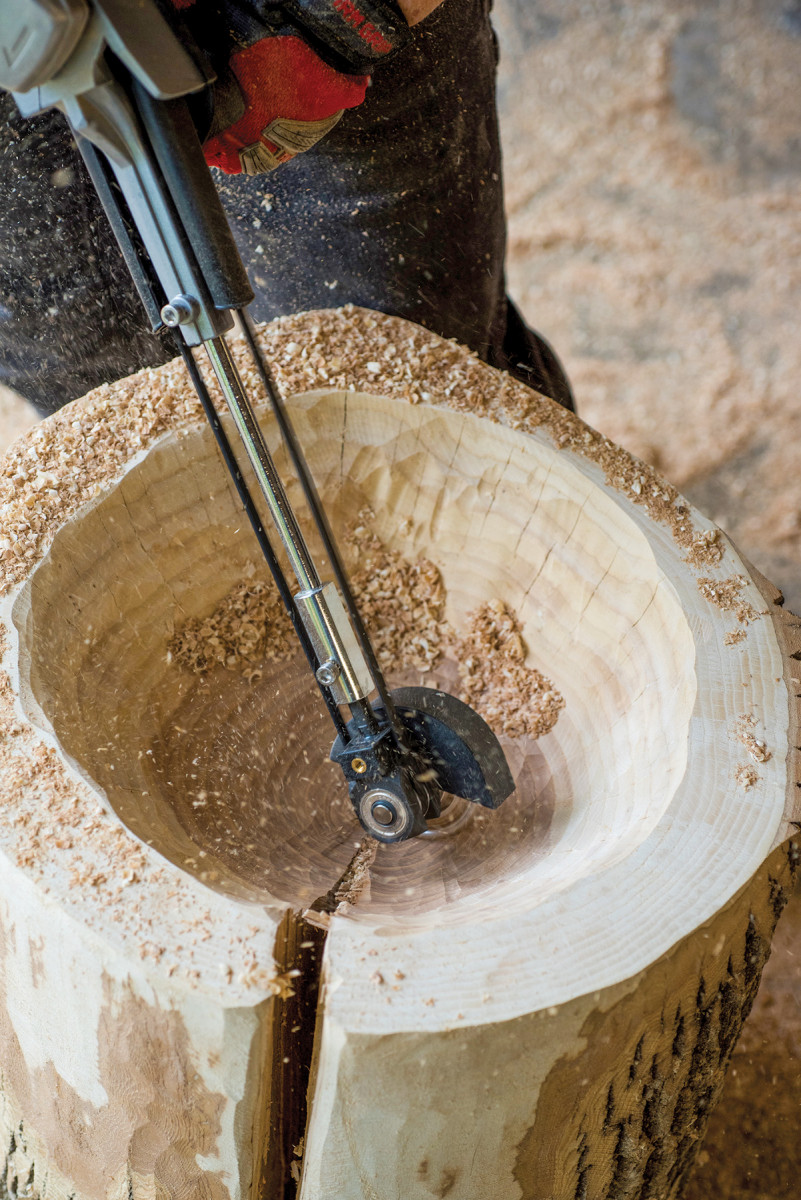 A carving dish on angle grinder removes the remainder of material on large table leg cutaway.