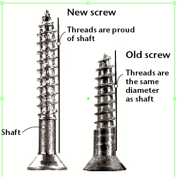 As the process of creating threads on screws evolved, the relationship of thread size to screw shaft changed. The threads on the right screw were cut into the shaft leaving, the thread diameter equal with the shaft. Threads on new screws (the screw on the left) are pressed into the shaft causing the thread diameter to be larger that that of the shaft.