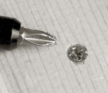 Counterbores and pilot holes help to reduce the tiny amount of shredded steel collected on the tip of the driver, which is a clear indication of “cam-out.”