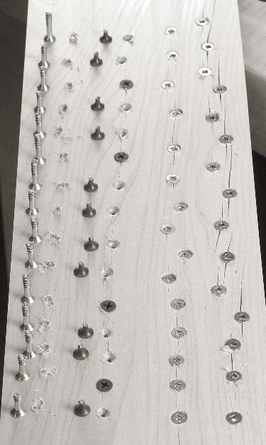 I began the test by driving five home-center screws. All five screws broke. They didn’t just break as the countersink made contact with the maple; the screws broke near the mid-point in length. Not one screw seated properly. Wow.
