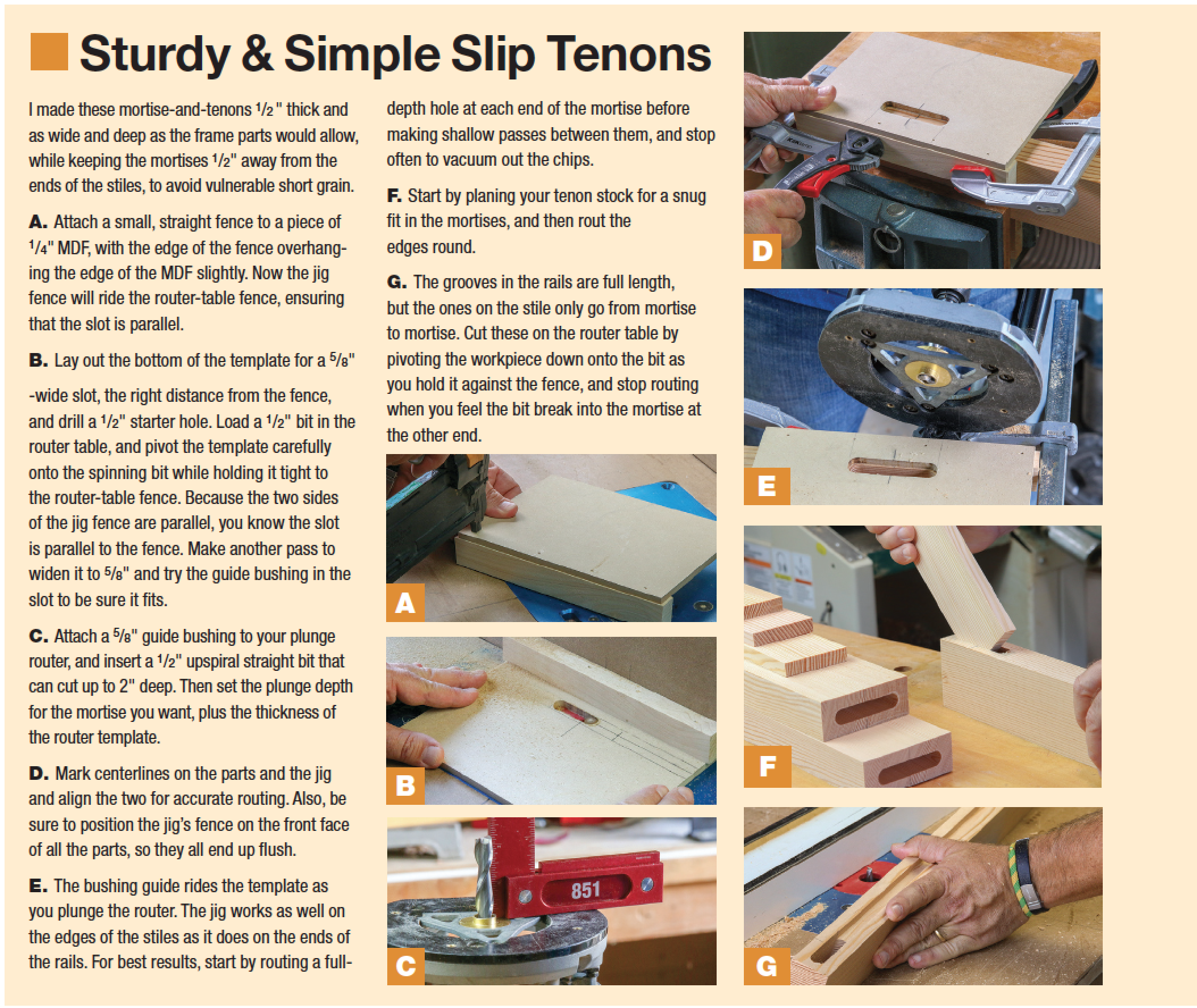 As for the joinery, it’s just hefty mortise-and-tenon, as big as your frame parts will allow. With so much width and thickness to work with, I went with slip tenons and matching mortises, which you can rout quickly with a single jig (see below). This template-routing jig is a favorite I learned about long ago when shooting an article by teacher and woodworker Gary Rogowski.