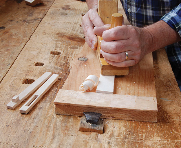 In making this type of mortise gauge, I start with the staffs (staves?). Mine are 5⁄16” x 5⁄8” and about 7-1⁄2” long. Use dry stock here; this is no green woodworking. The original is all beech. I did a couple versions to get the hang of it, using some beech and some maple.
