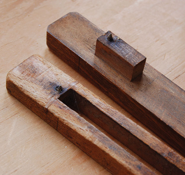 The notch in one beam is 5⁄16” x 2″. I chop it with a mortise chisel. On the vintage gauge, this joint is quite precise, so it needs to be exacting work. Glued onto the other stave is a tiny piece of stock, pierced for one of the pins, that rides in the notch.