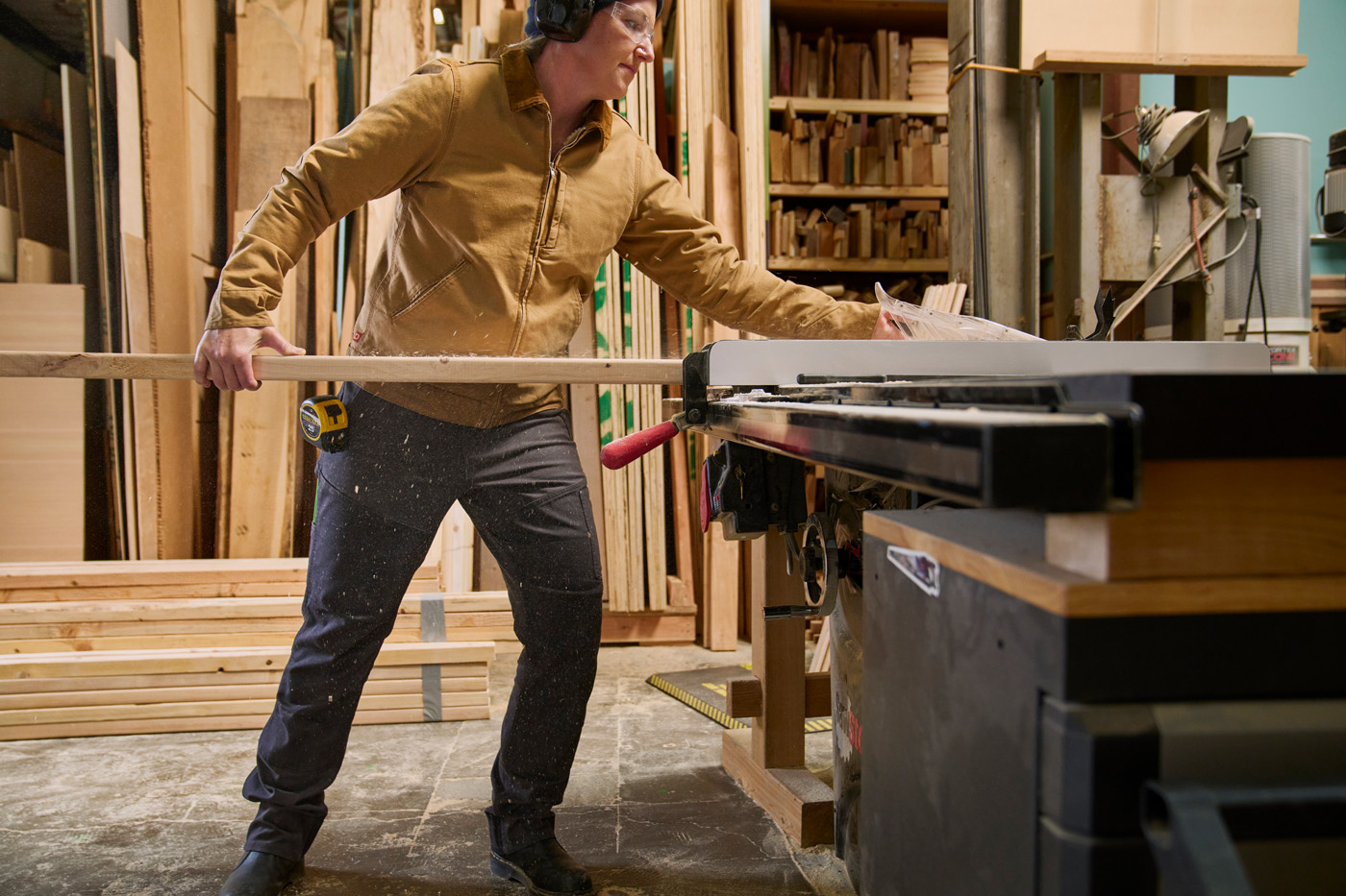 Garments originally designed around broader shoulders and straighter hips rarely match the range of body shapes found among women in the trades. In a shop or on a jobsite, clothing that pulls when reaching across a workbench, stabilizing a board, or guiding a sheet through a table saw can interfere with control and precision. Waistbands that won’t stay secure under a tool belt and tops that shift during overhead sanding or installation disrupt both comfort and focus. Over time, these issues can lead to unnecessary fatigue and, in some cases, create safety concerns. A pant leg that catches on a saw stand or while navigating piles of lumber can introduce hazards in environments where balance and steady footing matter. Fabric that tears during kneeling can also compromise mobility at moments when consistent control is essential.