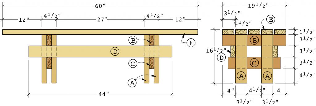 Then cut all your pieces to length as shown in the cutting list below. What’s important to remember here is that it’s not critical if you cut your legs a bit long or cut the top boards a bit short. What is important is that you cut all the legs the same length, whatever that turns out to be. For that reason, I recommend “gang cutting” your parts.