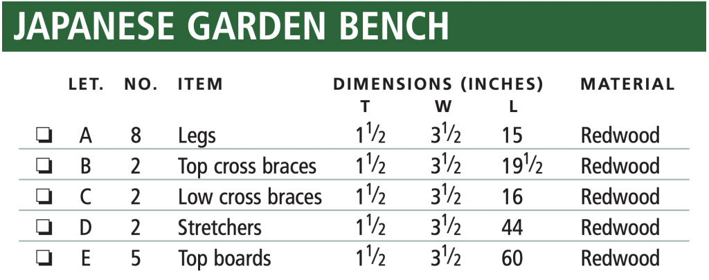 This bench is designed to be built using just five 10′-long 2x4s. You can build it from sugar pine, paint it and spend less than $10 ($60 as of 2022). I always liked redwood for my outdoor projects (and that’s what the originals were made from) so I spent the extra cash – about $200. No matter what species you choose, select the straightest, most knot-free 2x4s you can find.