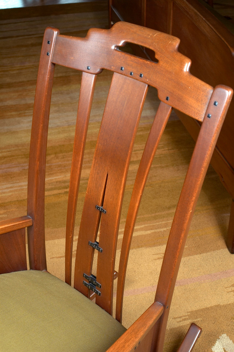 Faux ebony splines were also used where the back leg of a chair meets the crest rail (Photo 11). There’s a real mortise and tenon joint inside, but the spline is not a functional part of the joint. Perhaps one of the most notable and successful uses of a faux ebony spline was on the Blacker living room armchair. The spline is quite prominent at the point where the arm joins the front leg.