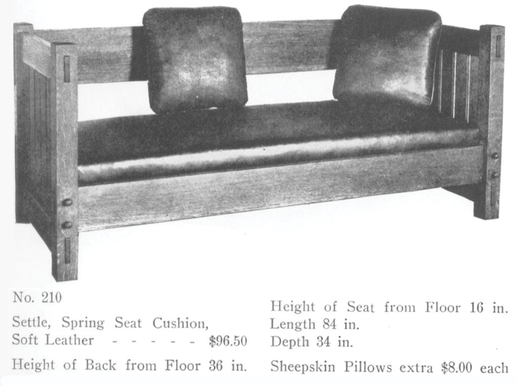 The cabinet work from the Craftsman Workshop Catalog D circa 1904 describes the Settle #210 as, “Made in Craftsman Fumed Oak. 36“ high, 84“ long, 34“ deep. Seat cushion covered in Craftsman canvas or leather. The size of the seat cushion is such that only one out of every one hundred hides is large enough to cover it. This is our largest settle, and the only piece we ship “knocked down.” It is long enough to allow the body to recline at full length. The tenons projecting through the front and back posts are pinned, and form a pleasing decoration.