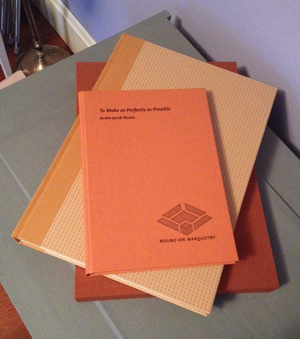 The limited-edition deluxe version of “To Make as Perfectly as Possible: Roubo on Marquetry” is a thing of absolute beauty in both form and content. It is far and away the most handsome modern book I own (and that I’ve handled). It’s also, at 12″x17″, the largest – which is important because that’s the same size as the Andre-Jacob Roubo’s 18th-century original; at this size you can see incredible detail in the full-size plates. And, because it’s printed on absolute top-quality paper (#100 Mohawk superfine), there is incredibly crisp reproduction. The binding is gorgeous (a spine of Italian fabric printed in gold and black foil, with boards covered in #printed #80 Mohawk loop antique vellum), and it comes in a handmade slipcase.