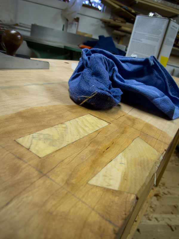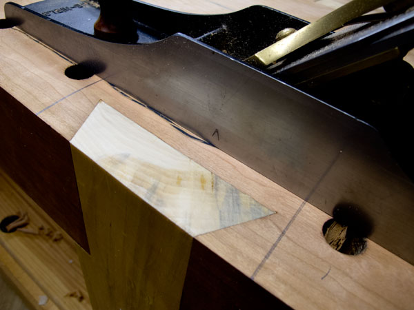 These stop shavings effectively take the end grain out of the equation during your long-grain strokes along the benchtop. After a few full-length passes, I return to the end-grain areas and knock them down a little more.