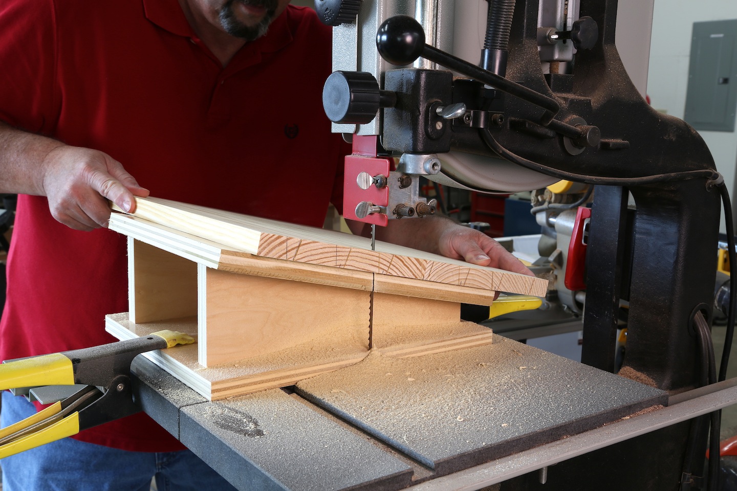 Setup is easy. Place it on your band saw table, then cut into the jig just a bit so you have support right at the blade. Be careful that you don’t constantly push the jig into the blade. (After years of use while teaching, my home-shop jig is all but cut through the supports.) One way to hold the jig steady is with spring clamps, as you see in the photo above. If the Popular Woodworking Magazine shop band saw did not have a granite top, I would install rare-earth magnets into the bottom to hold the jig still.
