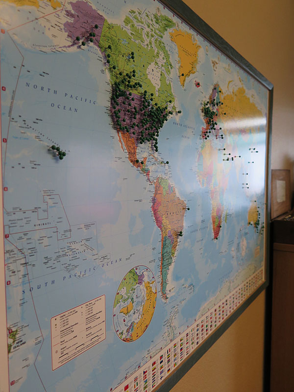 After all that, the finished tools are shipped out to customers all over North America and the world. The company keeps a world map on the wall with a pin for every new place Blue Spruce ships a tool. Today Jeske pointed out two new pins they put up this week – one in Barcelona, Spain, and the other in Dubai.